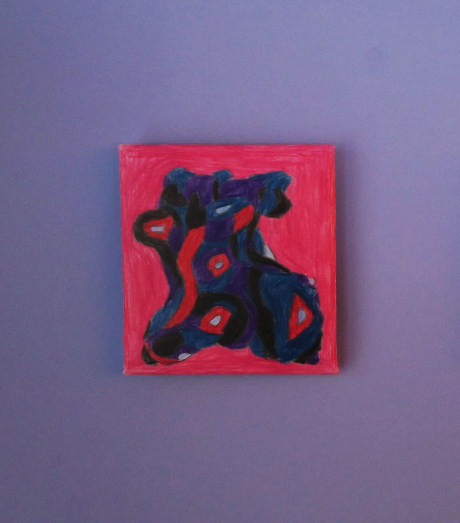 In this piece, bold strokes of deep blue, violet, and red seem to pulse against a vivid pink background, creating a sense of movement and inner tension. The shapes fold and twist into one another like shifting memories or half-formed thoughts, offering a visual map of feelings that resist clear definition.