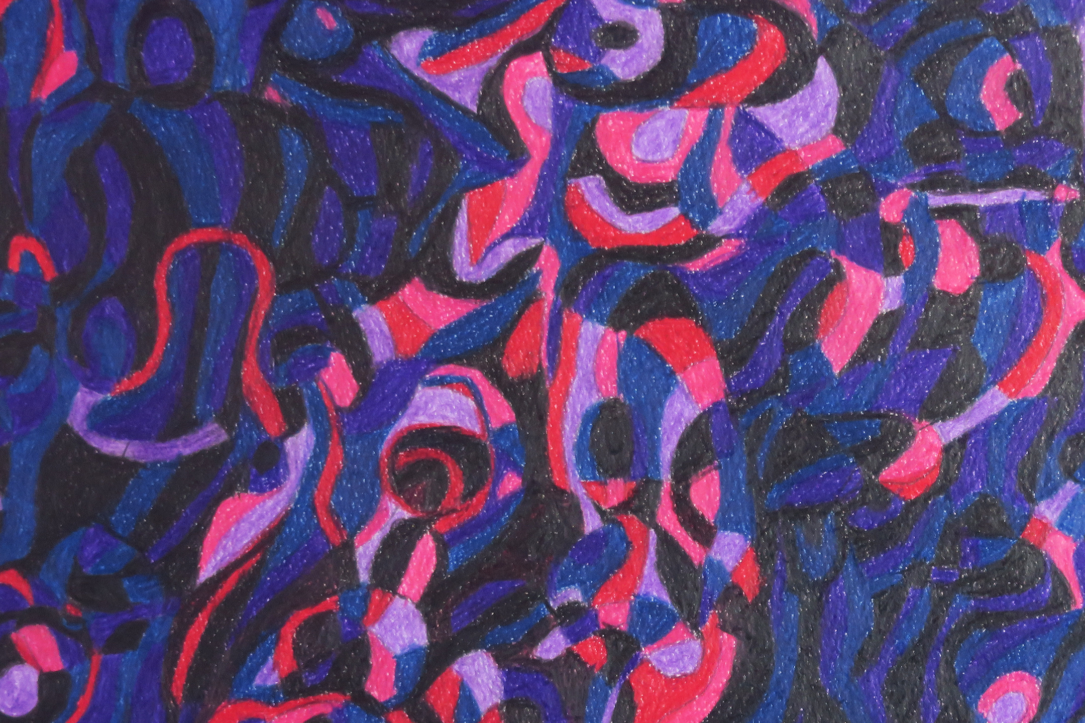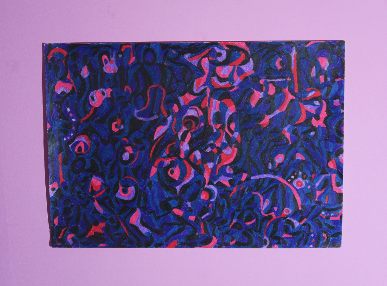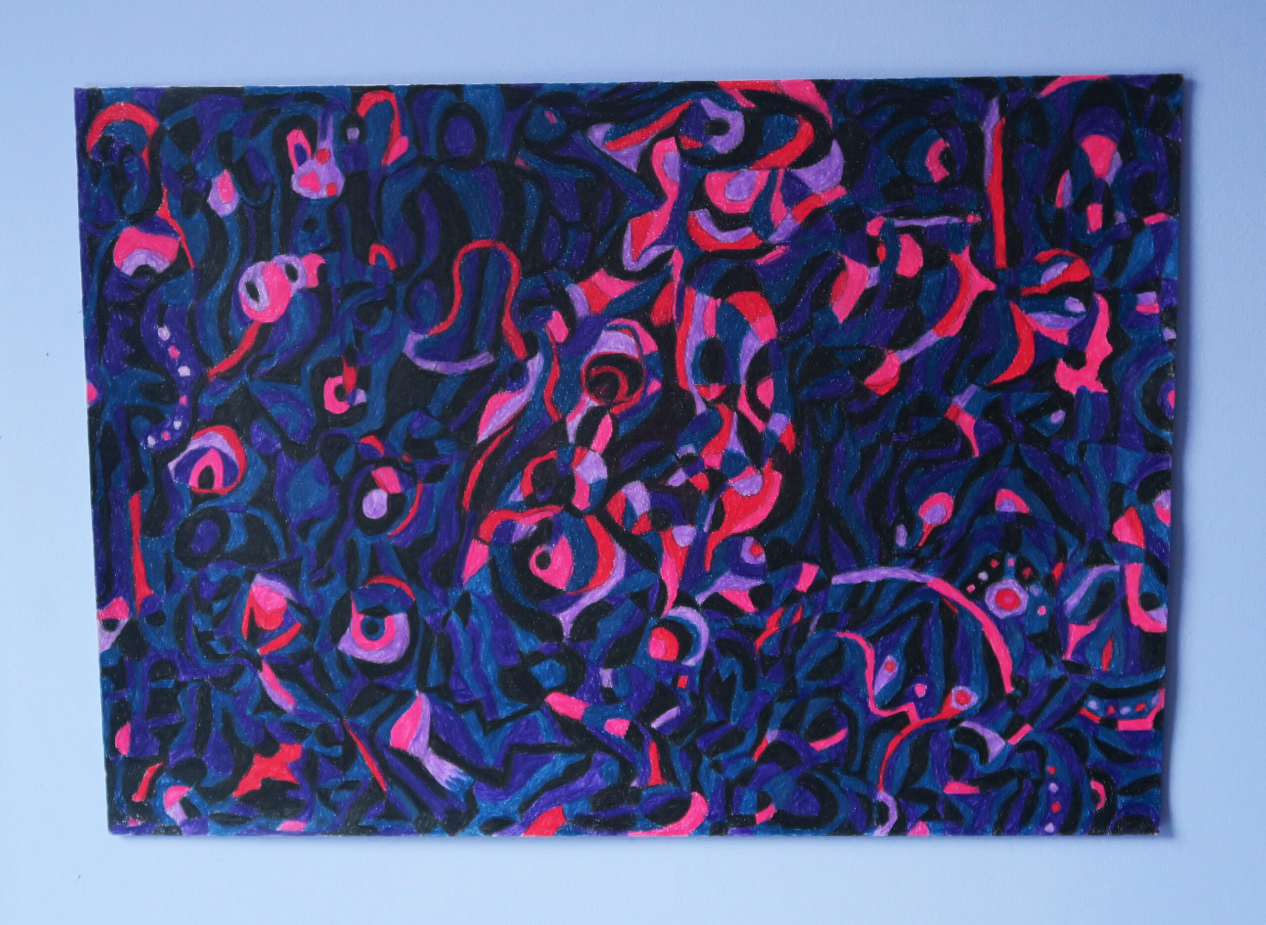 The deep blue and bright red-purple accents evoke a sense of mystery, movement and sustaining emotions. Something invisible is communicating in the darkness.