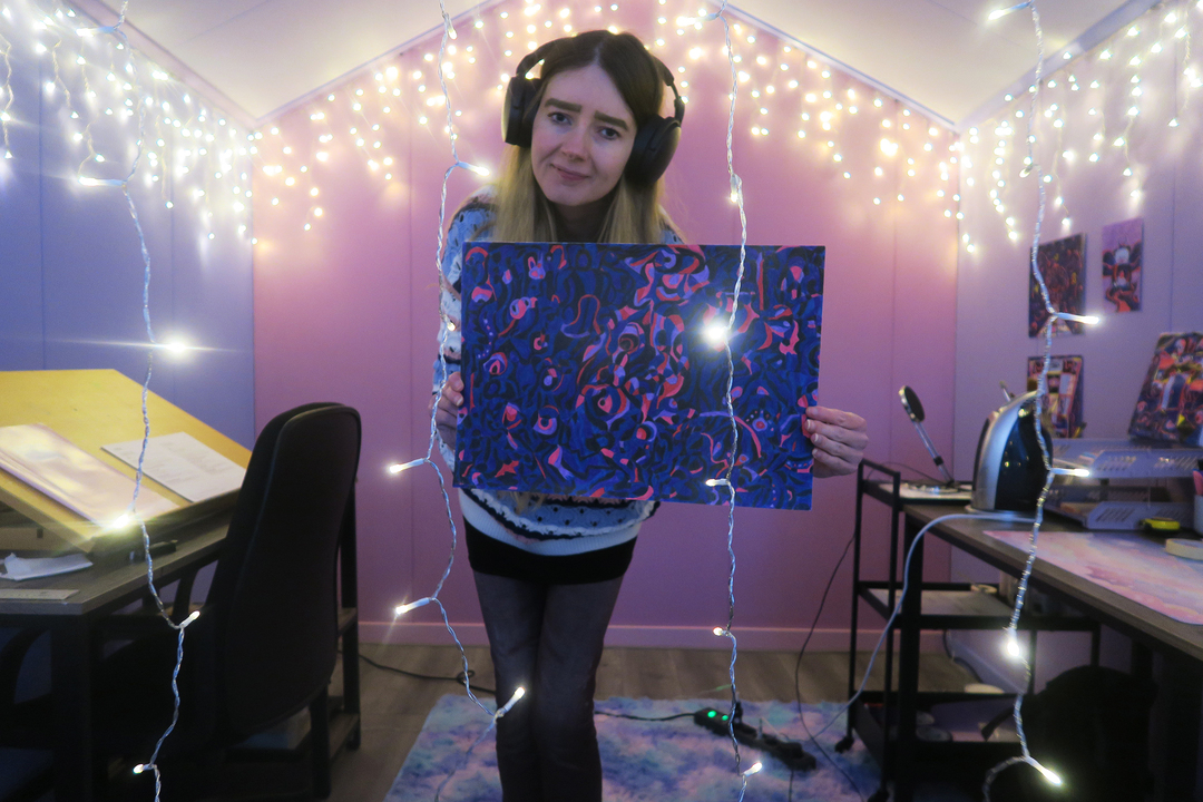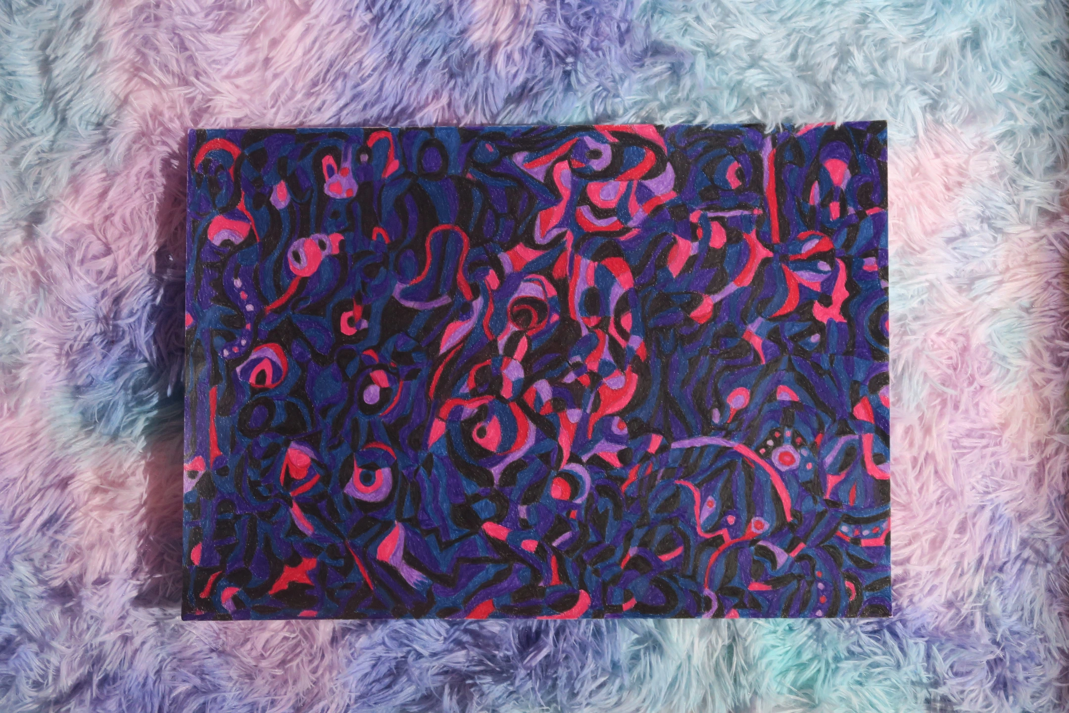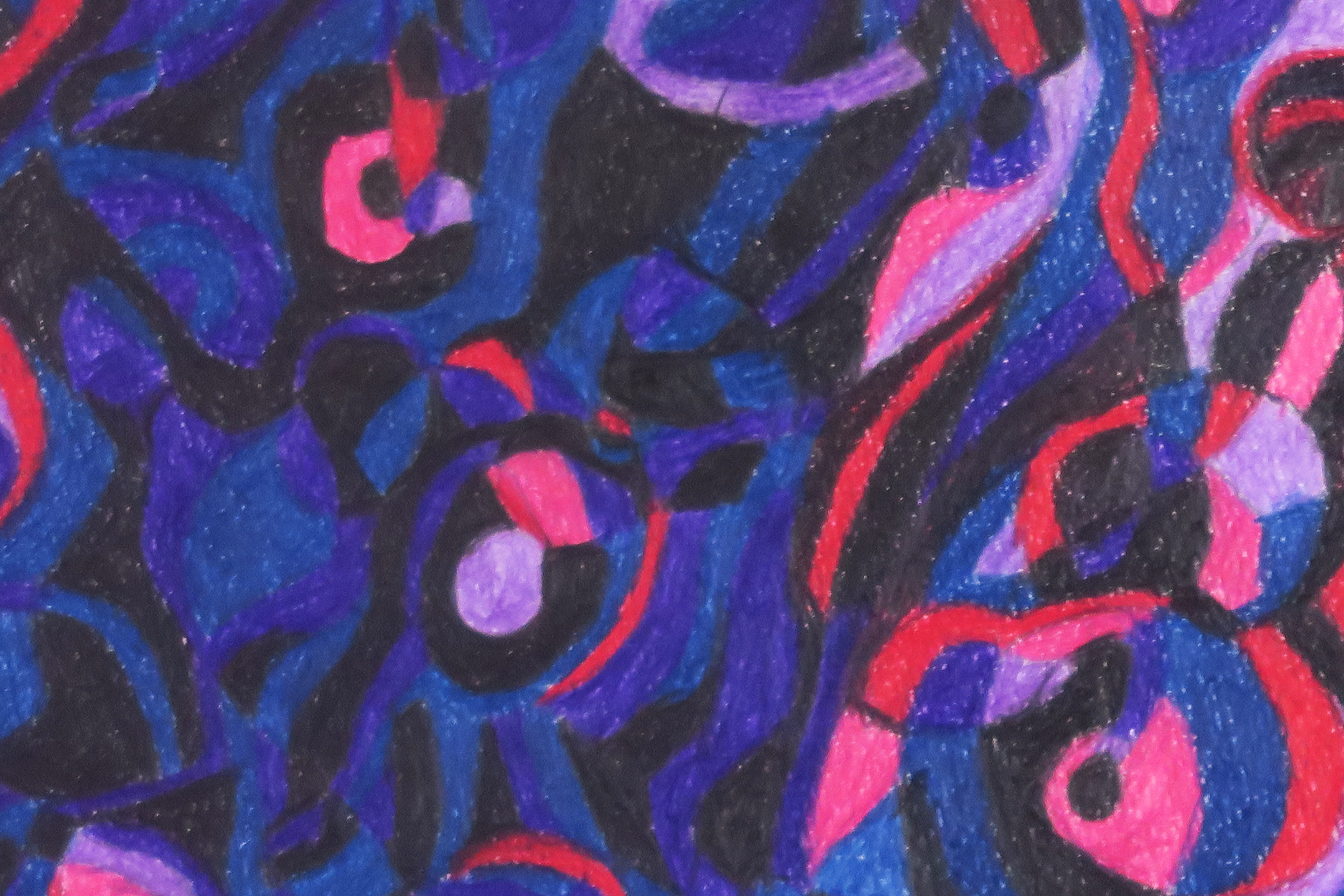 The deep blue and bright red-purple accents evoke a sense of mystery, movement and sustaining emotions. Something invisible is communicating in the darkness.