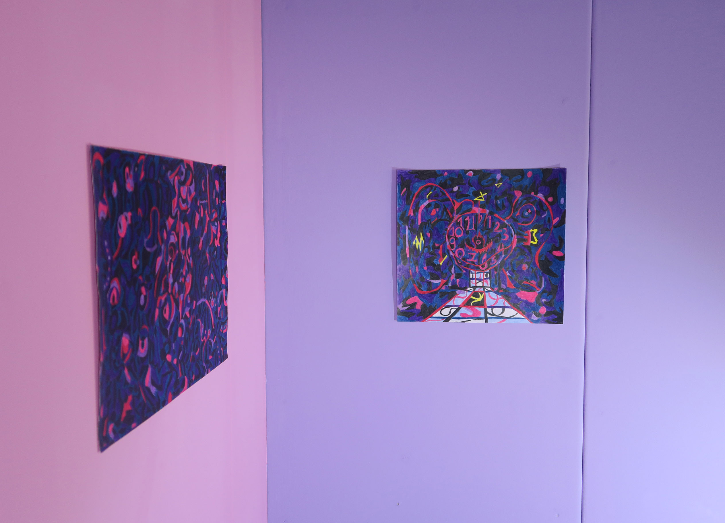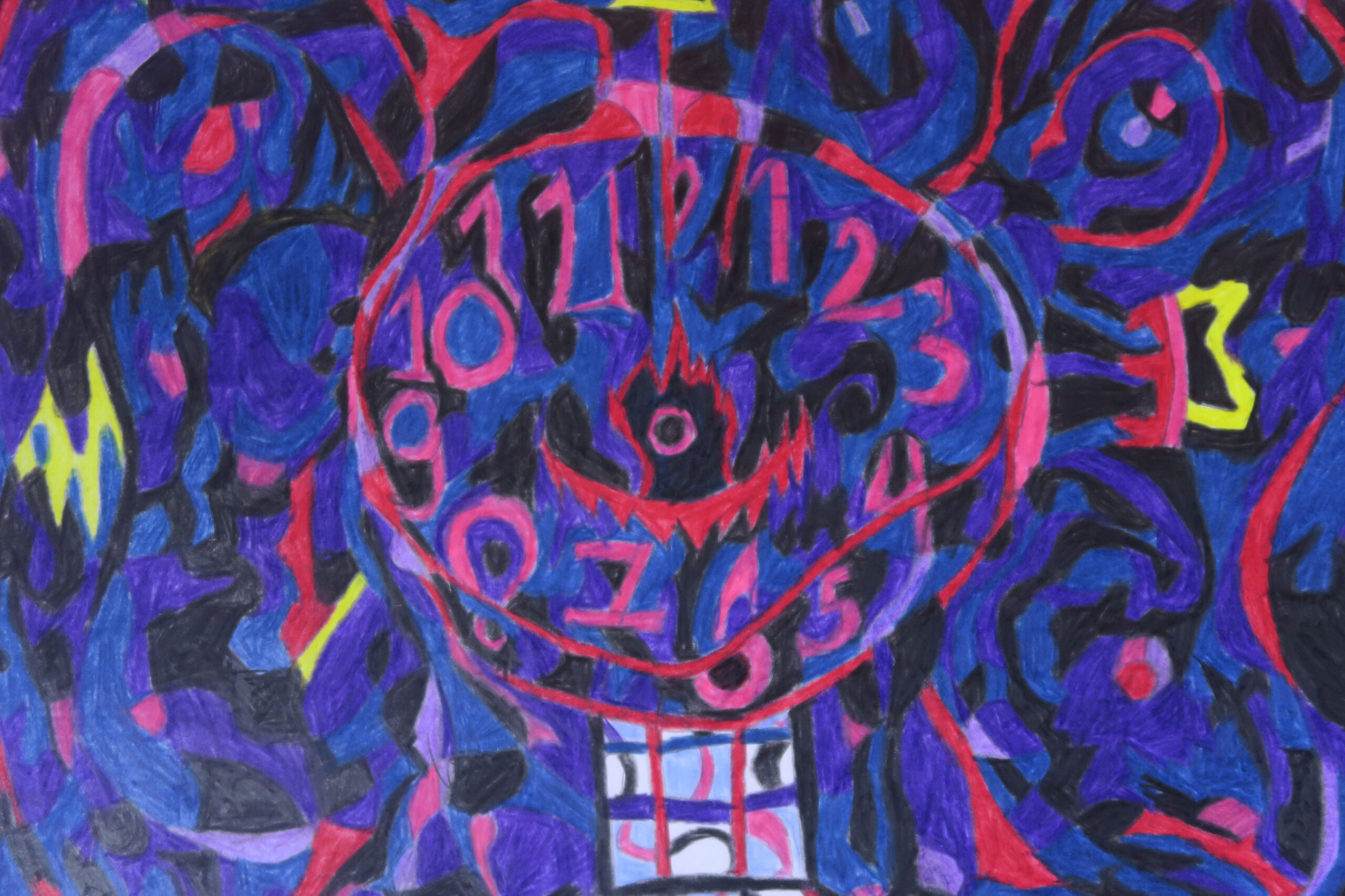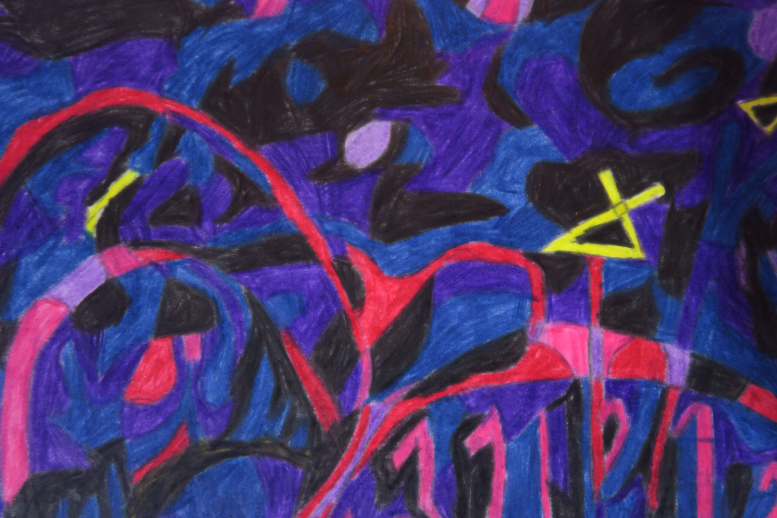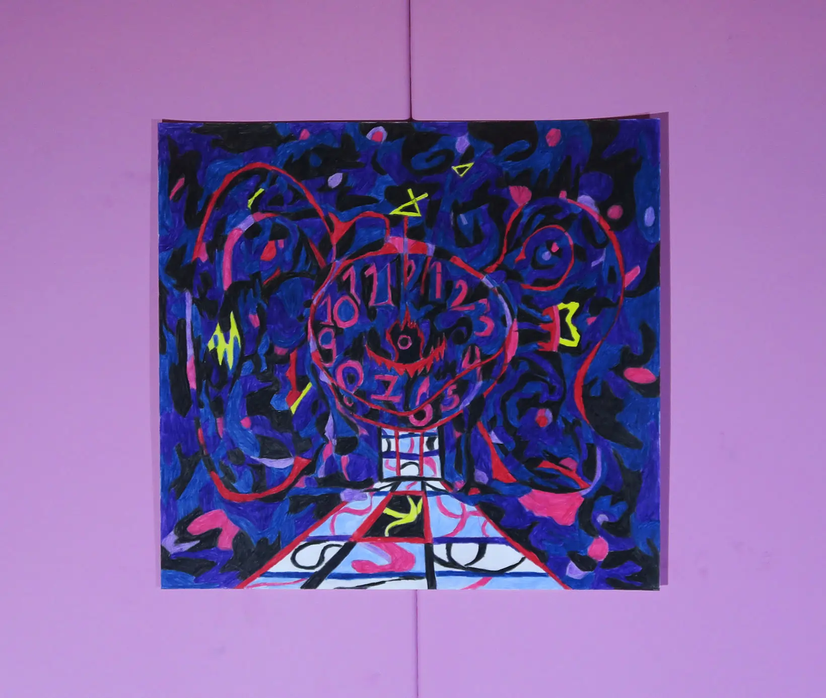 In this work I invite the viewer to peer into a surreal threshold where inner turmoil and external space converge. Through a chaotic interplay of color, line and abstract symbols, this work becomes a visual echo chamber of emotion, a map of the intangible.